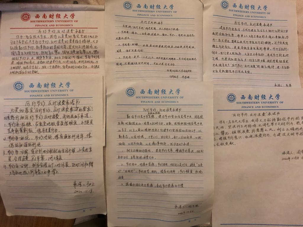 会上,胡相伟带领全体同学深入学习了习近平总书记关于厉行节约、反对浪费的重要指示精神。会议详细阐述厉行节约、反对浪费是中华民族的优秀传统美德,是我们在长期生活实践中形成的光荣传统,是习近平总书记对全社会倡导的时代新风。随后,参会人员通过观看央视视频“厉行节约 反对浪费 从你我做起”,巩固主题学习,深化自身认识。李君皓、张卫等同学围绕会议主题就自身实际出发进行了交流发言,指出老员工应该将“厉行节约 反对浪费”观念落实到日常行为中去,例如食堂吃饭光盘、寝室循环用水、随手关灯关电等。此次活动同学们还通过书写“厉行节约 反对浪费”承诺书,把感悟写在纸上、记在心中、行在生活中。最后,谢老师总结了本次会议,分享自己对于主题的感悟,殷切希望同学们能够增强厉行节约、反对浪费的思想觉悟。