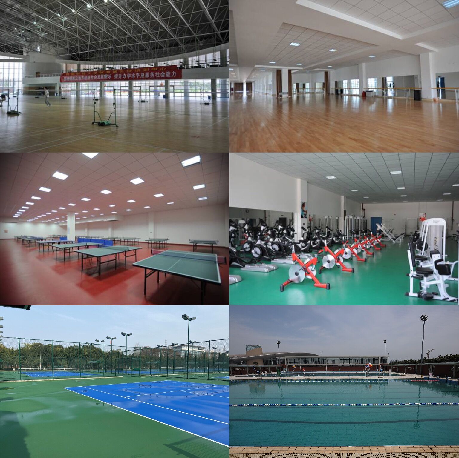 综合体育馆包括2片标准篮球场、羽毛球场、器械健身房、单车房、瑜伽室、乒乓球室、台球室、多功能形体室、员工体质健康测试室、运动人体科学实验室。馆内同时配备有LED大屏、音箱系统,是学校举办大型活动、大型赛事的重要场所。