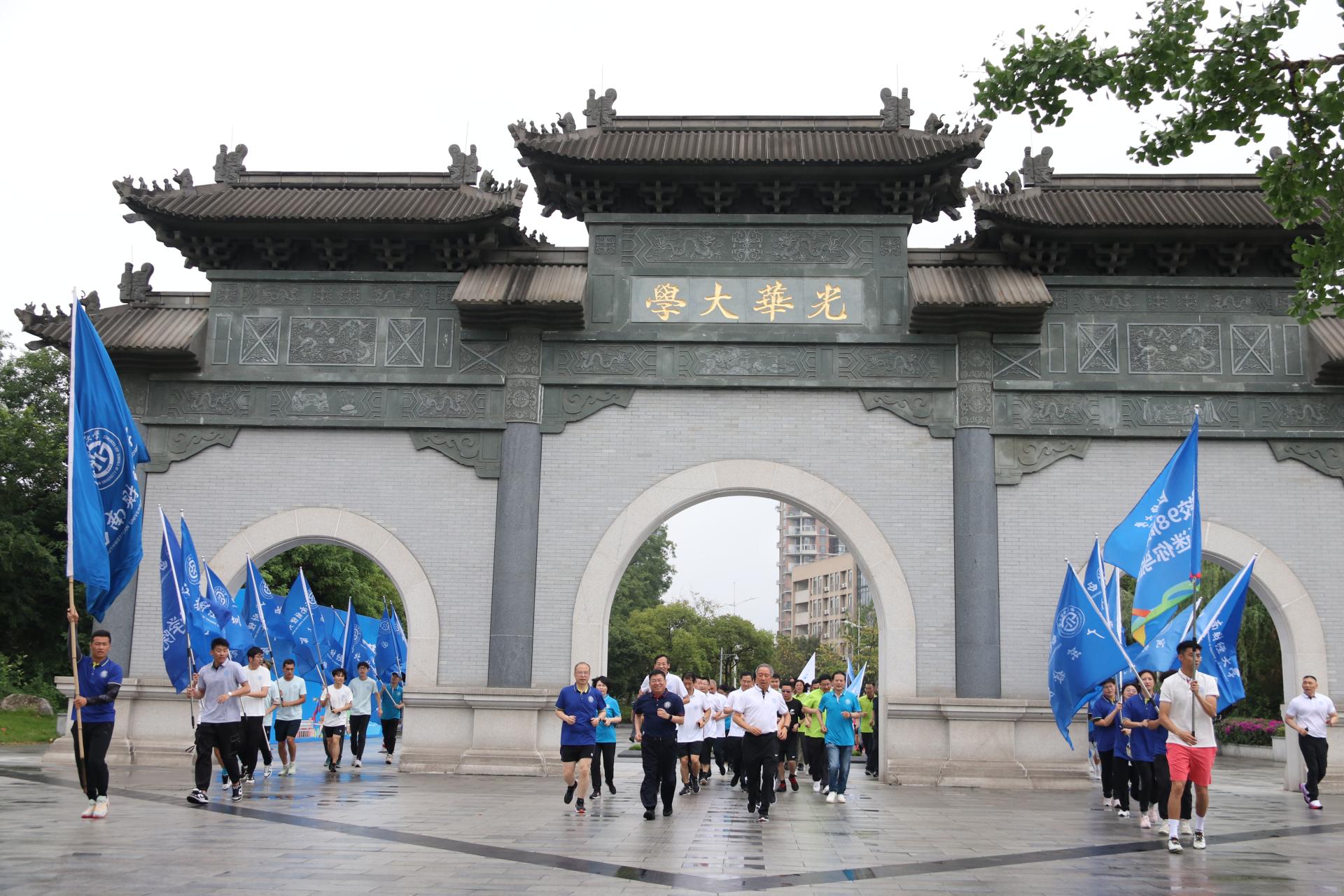 上午9时,“健康跑”首先在光华校区拉开帷幕,党委副书记、副董事长李永强,党委常委、副董事长张邦富带领相关中层干部及师生穿过芳草绿树,感受学校的深厚底蕴和“大运会”带来的蓬勃朝气。10时30分,在大屏幕上员工们声声祝福、校舞蹈队激情献舞的烘托下,党委书记赵德武发令枪声响起,柳林校区校庆“健康跑”活动正式开始。师生们身着印有校徽的五彩运动服从腾骧楼前启程,途径梅园、创业大道沿线,穿过光华大学校门来到济民广场,最后行经经世楼到达终点北大门。伴随“发展体育运动、增强人民体质”“经世济民,孜孜以求”“我运动、我健康,我运动、我快乐”的响亮口号,师生们、员工们用矫健的步伐表达对学校的祝福、对健康的守护、对生命的热爱。