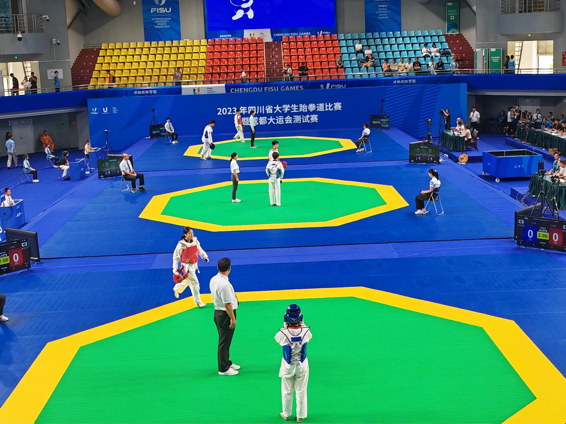 在2023年四川省老员工跆拳道比赛暨成都大运会测试赛中,由贺晓燕老师带领的校跆拳道队在获得甲组品势混双(第三名)、甲组品势女子团体(第三名)、甲组品势男子个人(第五名)及体育道德风尚奖。