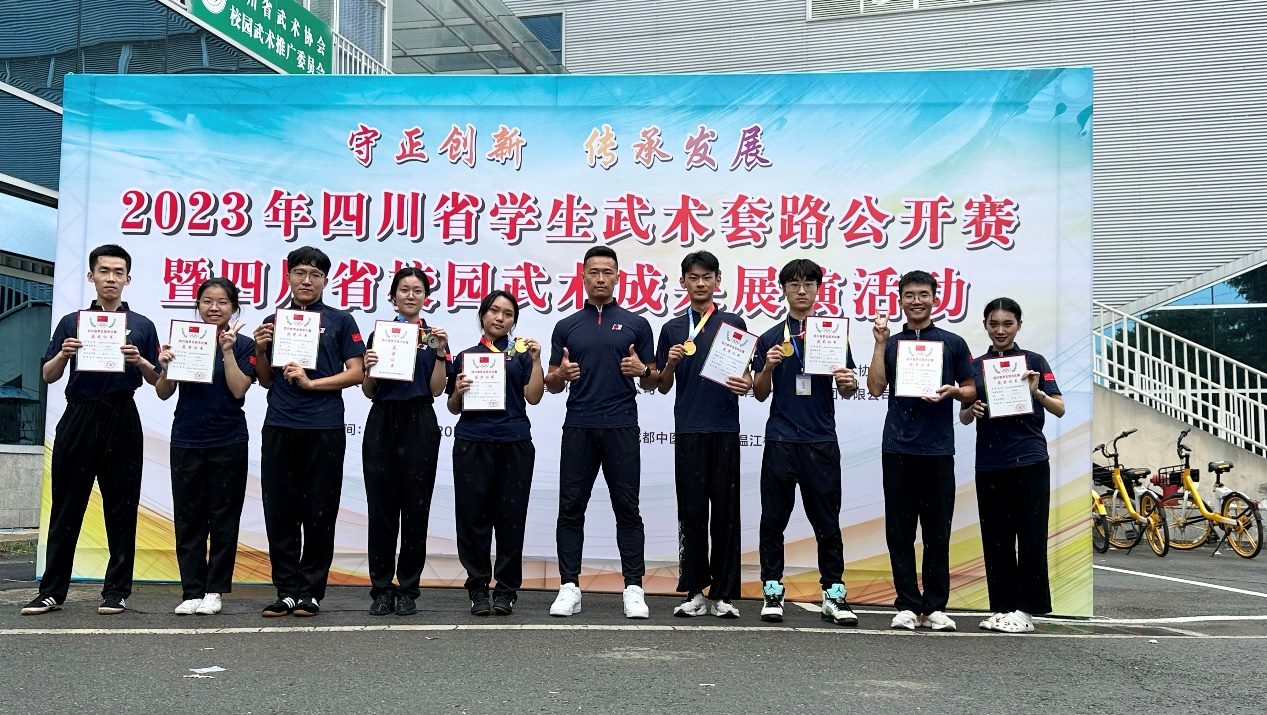 在四川省员工武术套路公开赛暨四川省校园武术成果展演活动中,由郭泽儒老师带领的校武术代表队参与男子八极拳、螳螂拳、长拳、南拳、虎拳、咏春拳、刀术、朴刀、八极枪与女子八极拳、八卦掌、虎拳、苗刀、朴刀、子午鸳鸯钺共15个项目,获得个人单项13金3银1铜的优异成绩。