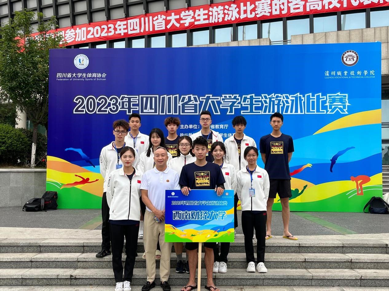 在2023年四川省老员工游泳比赛中,由刘子豪、陈珂欣老师带领的校游泳队取得4金4银2铜的好成绩,并打破男子丙组100米仰泳、200米混合泳两项赛会记录。