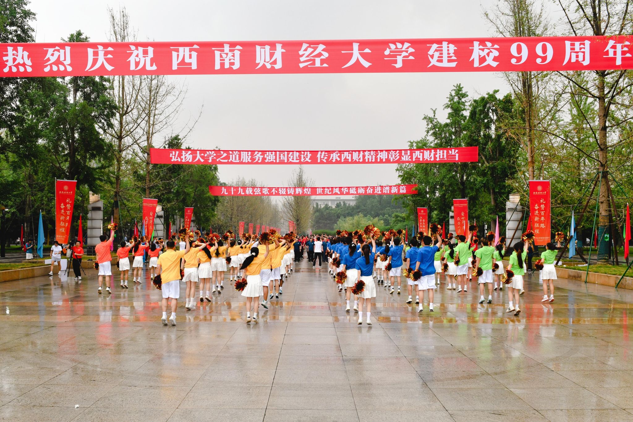 队伍环绕济民广场而行,《我和我的祖国》旋律悠扬,滚烫的爱国情怀浸透一词一句,在场师生员工思绪绵长,大家再次重温体悟学校百年来赓续红色血脉、矢志不渝教育报国的赤诚丹心。经世楼前,年轻的朋友们发出盛情邀约,欢快的鼓点萦绕在耳,如同催征号角,鞭策着全体西财人以更加饱满的姿态迎接百年佳期到来。道路两旁彩旗猎猎,师生们步履矫健,北大门广场歌舞欢腾,赴约百年华诞、共谋发展新篇的洋洋热情感染全场,激励大家怀揣“强国建设、西财担当”的壮志豪情迎向胜利的终点。