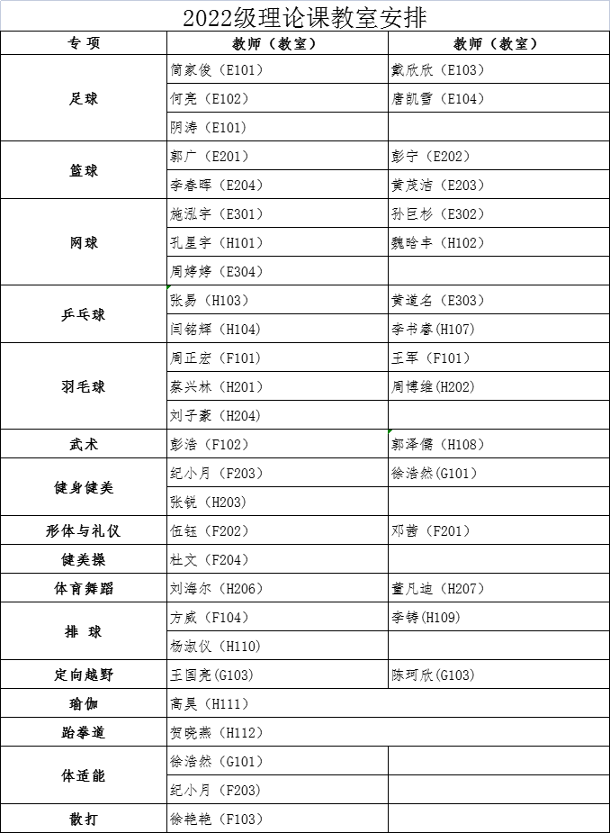 各学院: 经教务处同意,本学期2022级本科生第1周体育课为体育教学理论课,9月18日起恢复户外教学。根据教室资源状况,现将理论课具体安排通知如下: