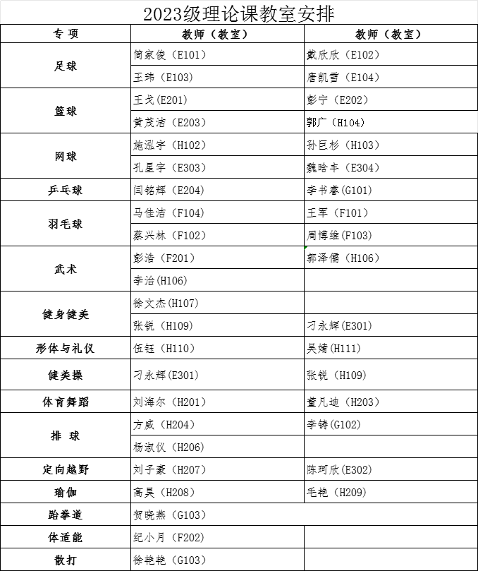 经教务处同意,本学期2023级本科生第1周体育课为体育教学理论课,9月14日起恢复户外教学。根据教室资源状况,现将理论课具体安排通知如下: