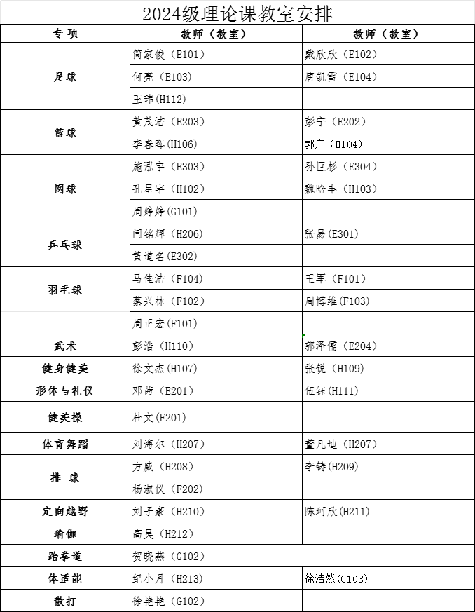 经教务处同意,本学期2024级本科生第3周体育课为体育教学理论课,9月29日起恢复户外教学。根据教室资源状况,现将理论课具体安排通知如下: