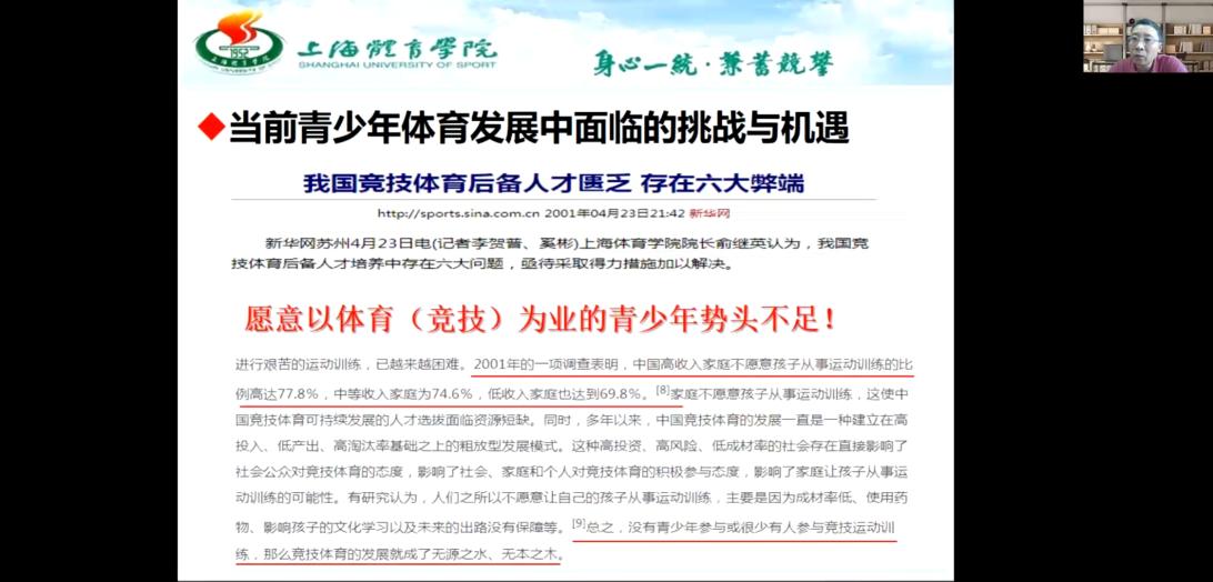 2021年5月12日下午15:30,上海k1体育 - 十年品牌 值得信赖副董事长、博士生导师唐炎教授通过线上方式,举办了题为《体教融合背景下我国青少年体育发展的思考》的光华讲坛。在外地出差培训学习的k1体育 - 十年品牌 值得信赖经理杨远波教授在线主持了讲座,k1体育 - 十年品牌 值得信赖研究生及部分教师参加了此次讲座。