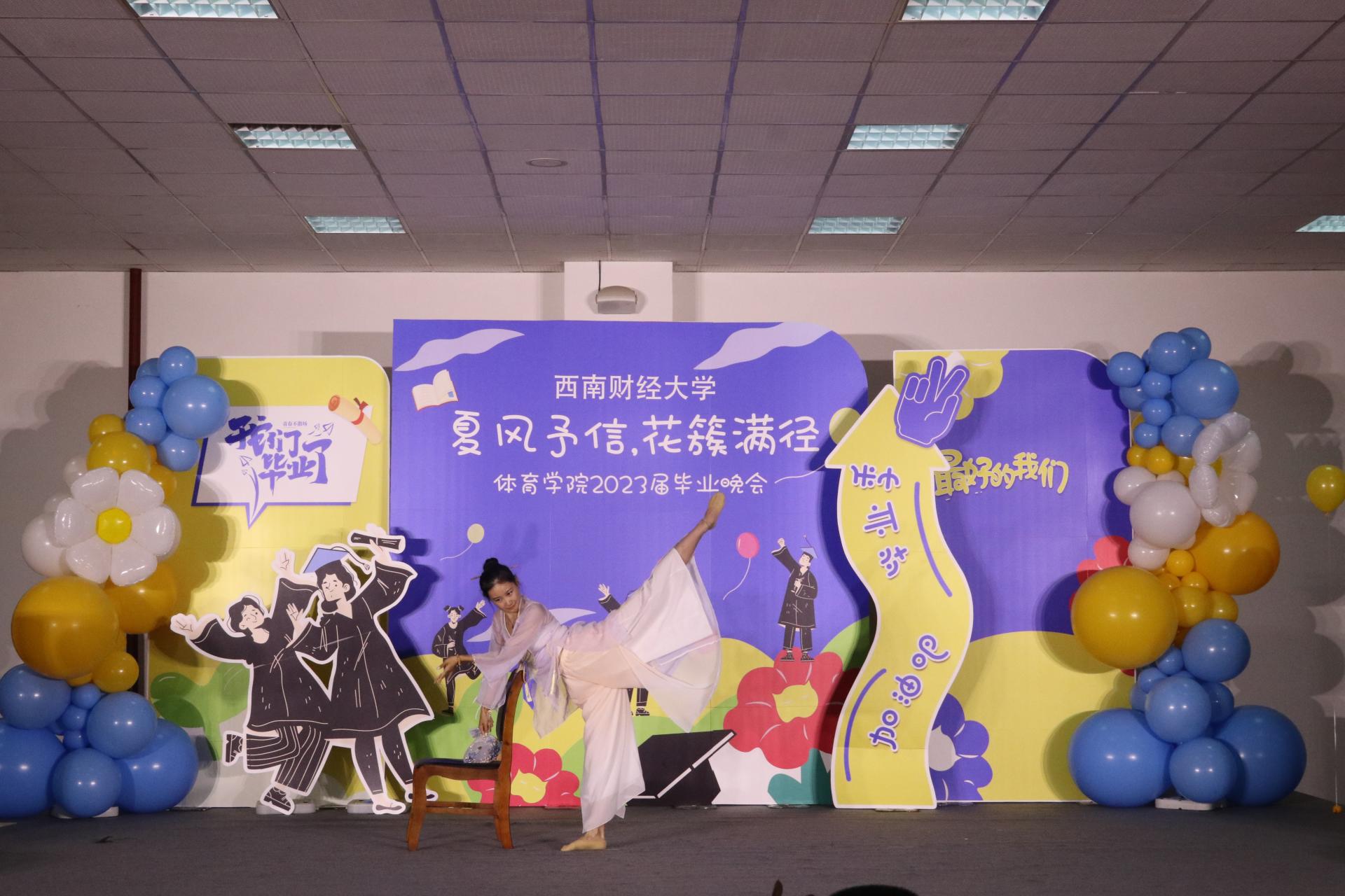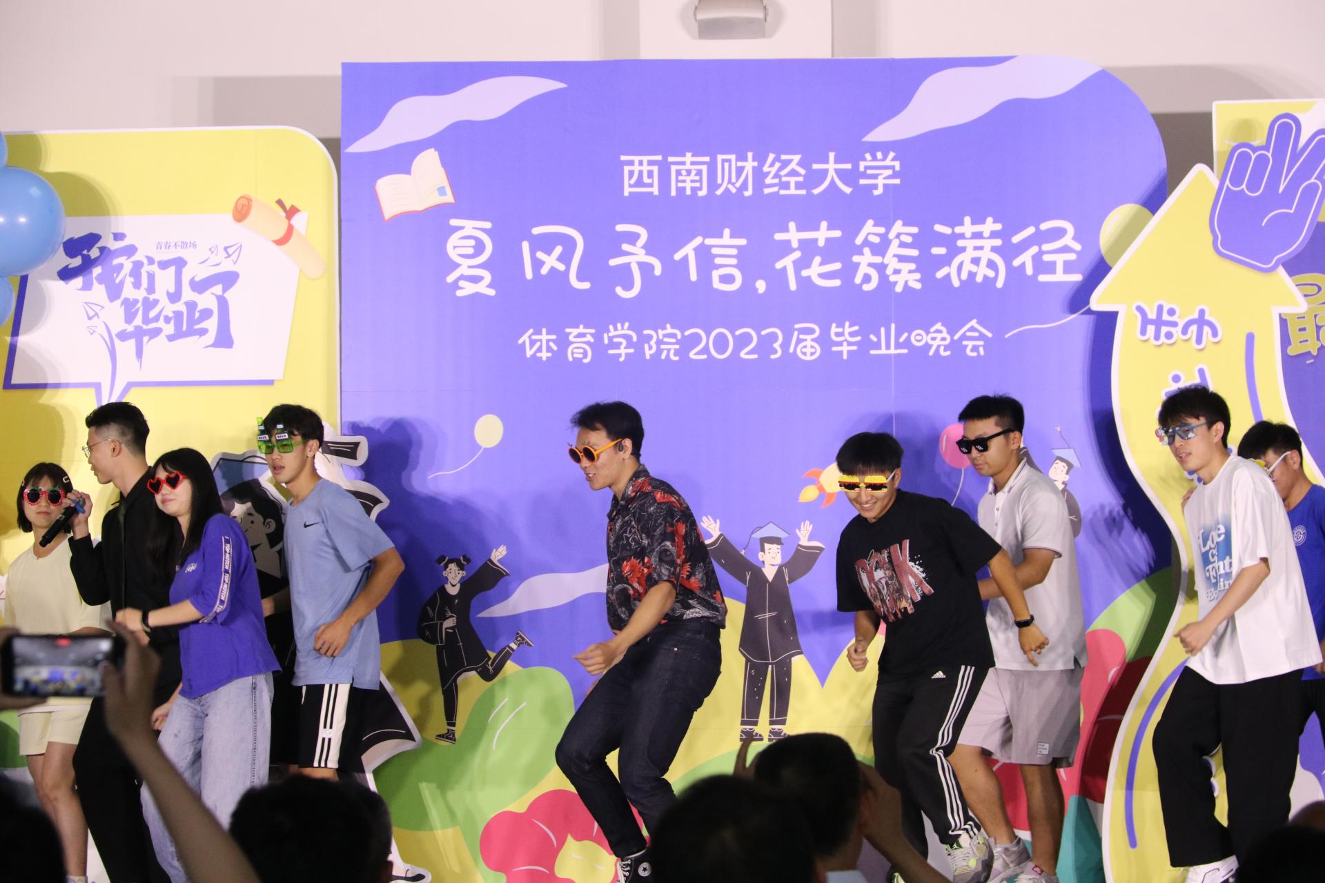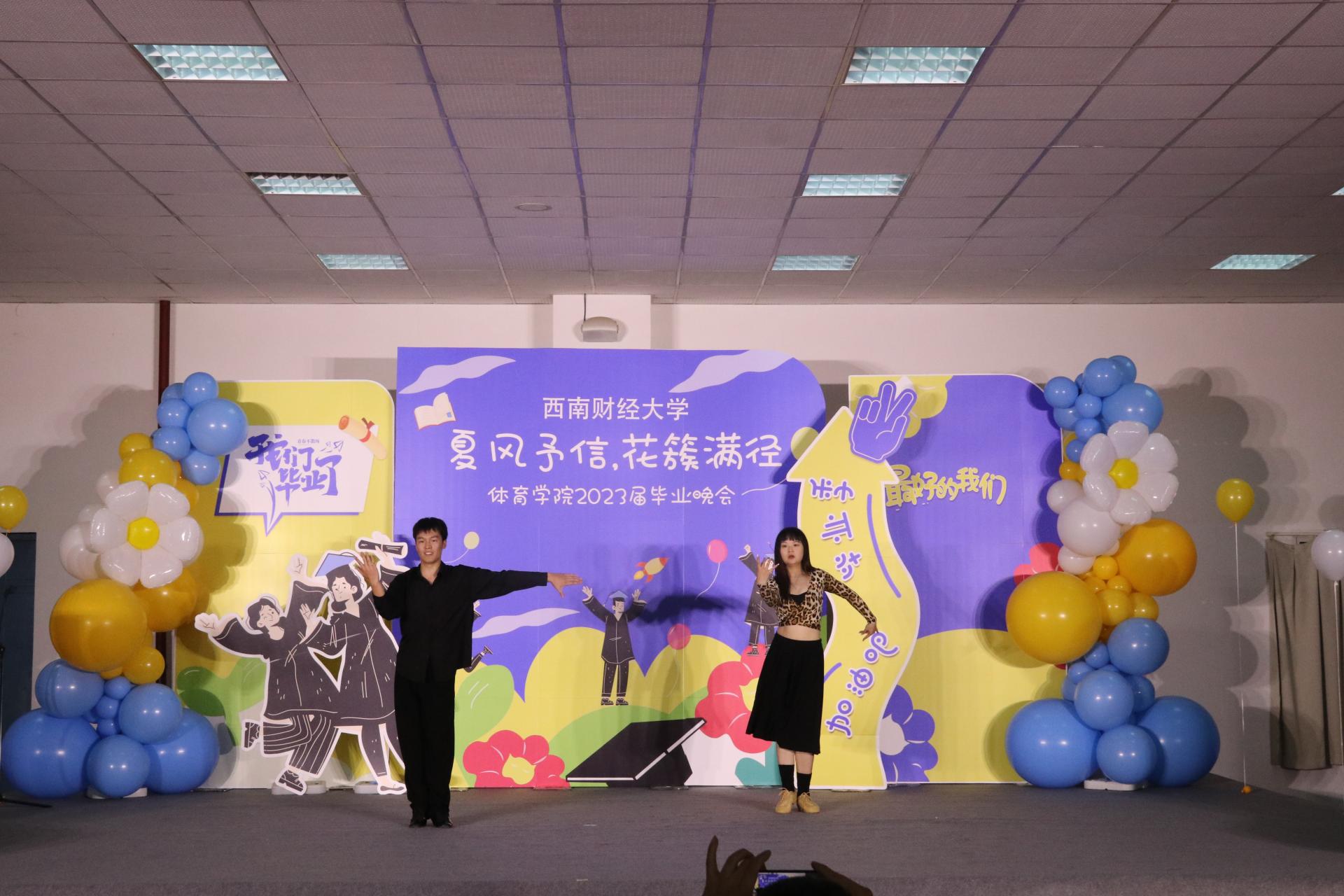 接下来同学们带来了丰富多彩的表演节目。歌曲《我的好兄弟》、《别怕变老》、《遥远的她》;唱跳《失恋阵线联盟》、《奇迹再现》;诗歌朗诵以及跆拳道、拉丁舞、古筝舞等表演。展现出西财体育学子积极进取的精神面貌,也表达了学院对毕业学子的深深祝福。