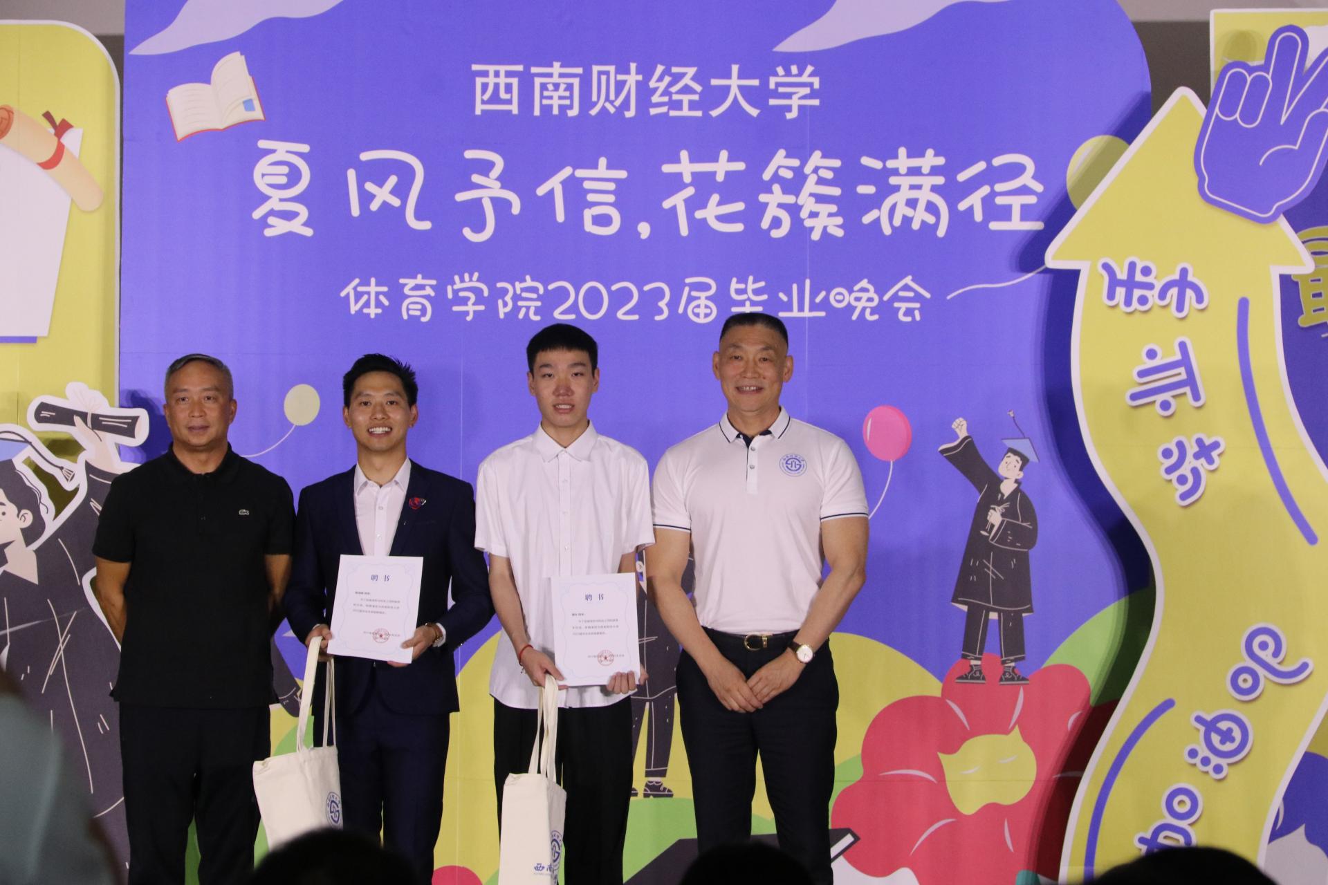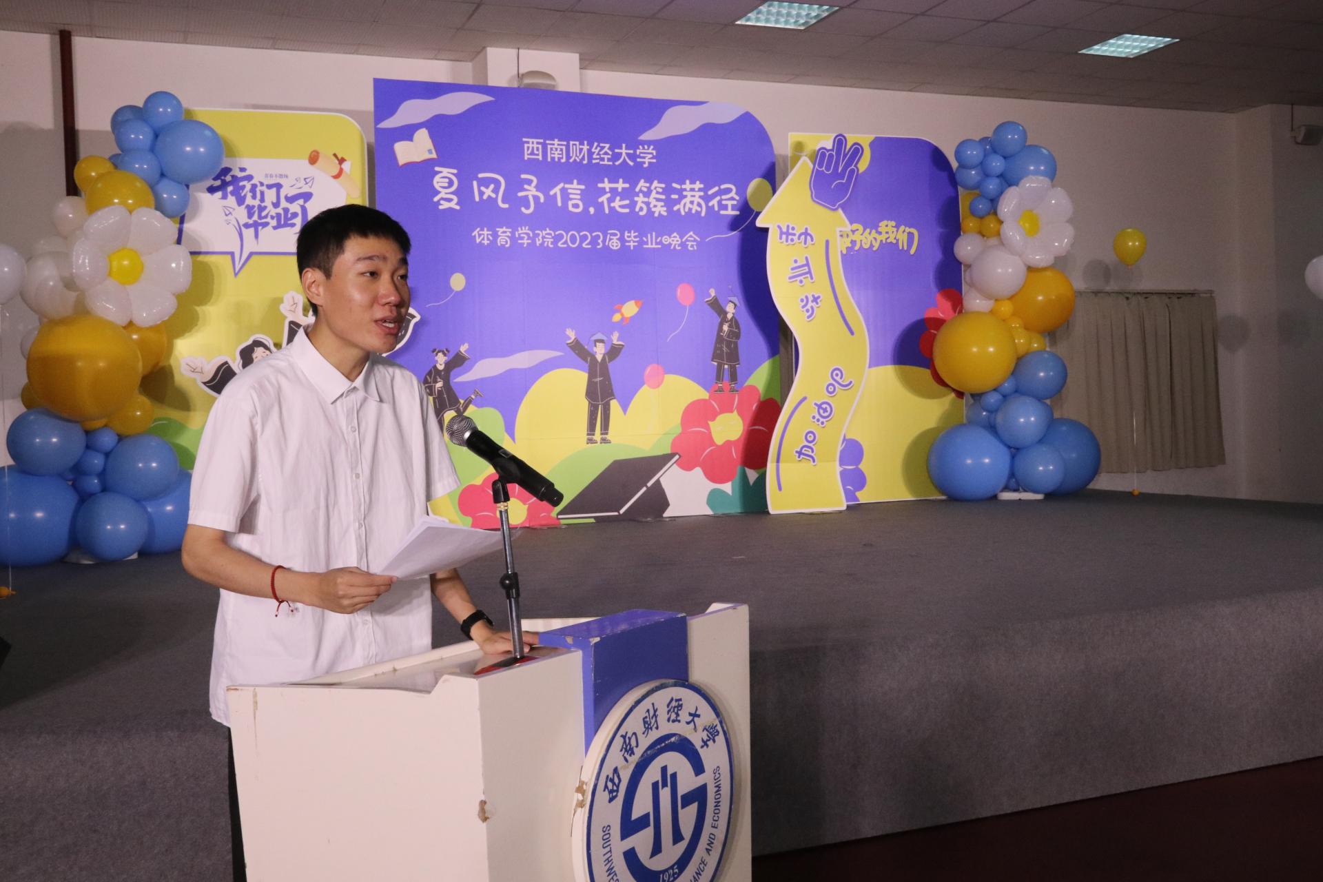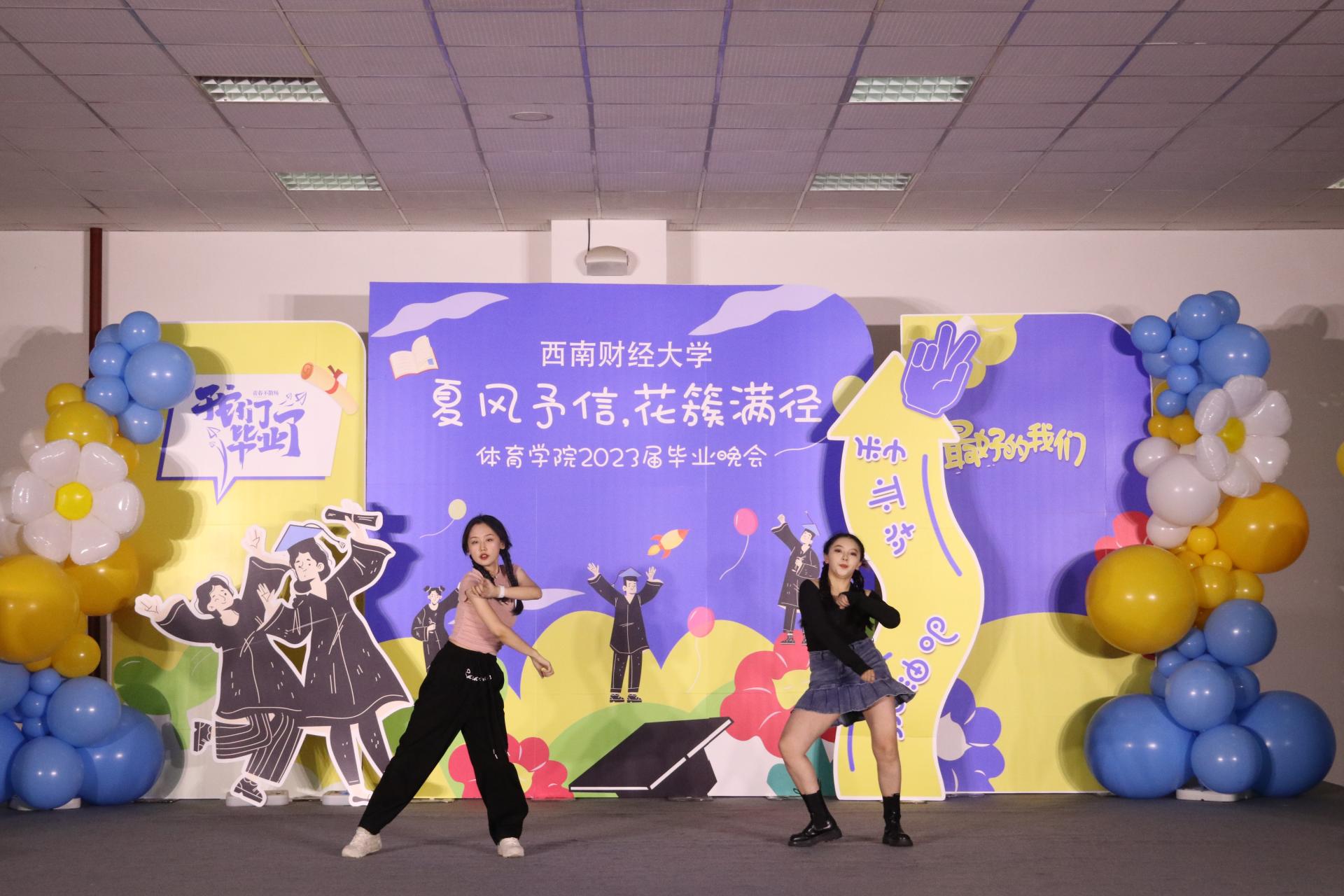 接下来同学们带来了丰富多彩的表演节目。歌曲《我的好兄弟》、《别怕变老》、《遥远的她》;唱跳《失恋阵线联盟》、《奇迹再现》;诗歌朗诵以及跆拳道、拉丁舞、古筝舞等表演。展现出西财体育学子积极进取的精神面貌,也表达了学院对毕业学子的深深祝福。