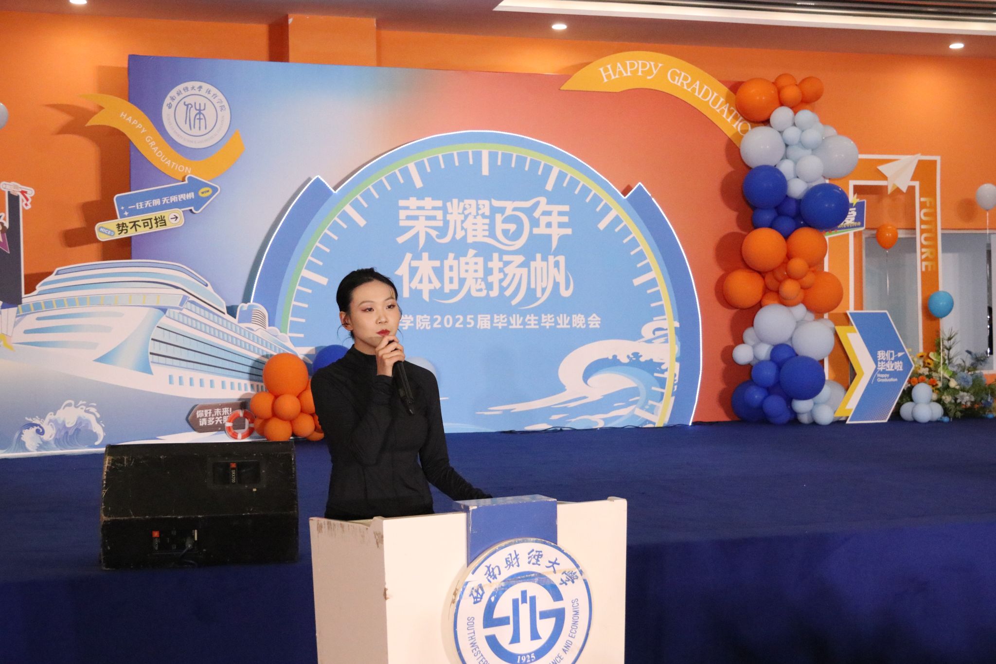 毕业生代表钟文艺发言,聚散终有时,未来诚可期,今天即将从西财启航,奔赴人生的下一段征程。无论我们未来身在何方,从事何种职业,请让我们始终铭记:西财体育赋予我们的宝贵精神财富——坚韧、拼搏、协作、追求卓越,让它成为我们克服困难、实现梦想的不竭动力。感恩学院对我们的精心栽培,感谢各位老师们的辛勤付出。